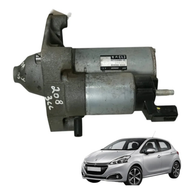 Motor de arranque original Peugeot aplicado na linha 208 equipada com motorização 1.2 3 cilindros. Componente responsável pelo acionamento inicial do motor do veículo, transmitindo movimento ao volante do motor através do pinhão no momento da partida. Peça proveniente de desmontagem, com etiqueta original do fabricante Denso e numerações identificadoras presentes na carcaça, vendida conforme as fotos.