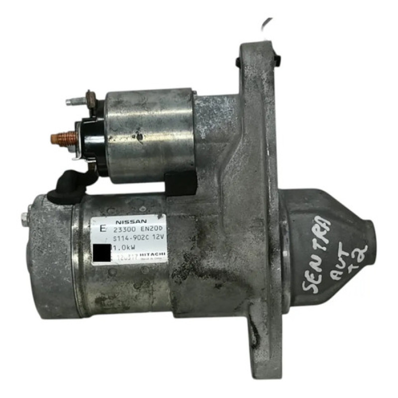 Motor de arranque original Nissan aplicado no Sentra equipado com motorização 2.0 dos anos 2009 2010. Componente responsável pelo acionamento inicial do motor do veículo, transmitindo movimento ao volante através do pinhão no momento da partida. Peça proveniente de desmontagem, com etiqueta original do fabricante Hitachi e numerações identificadoras presentes na carcaça, mantendo padrão original de encaixe e funcionamento.